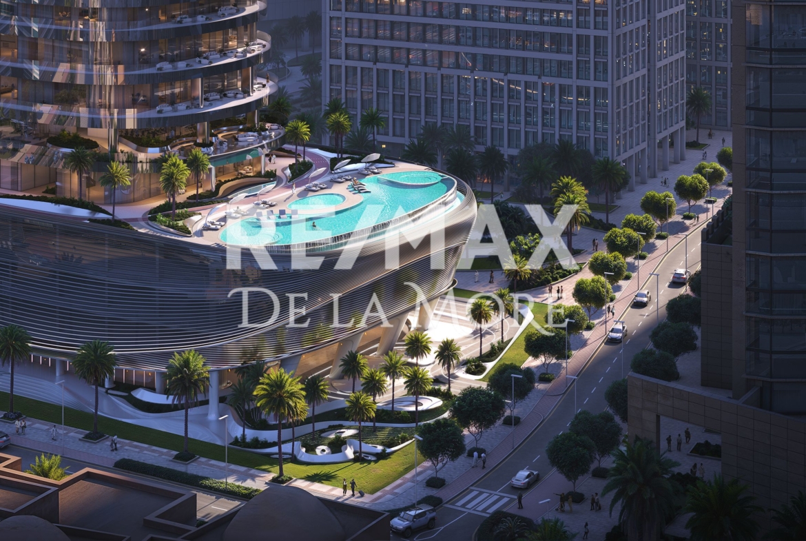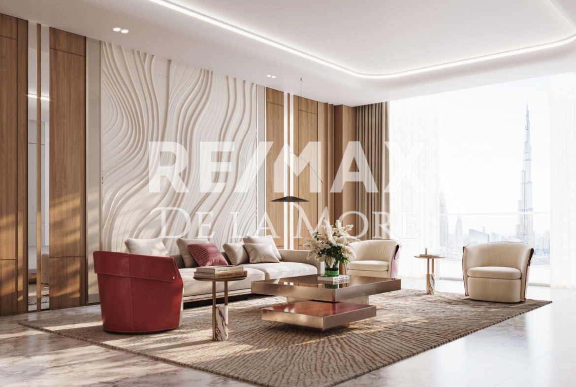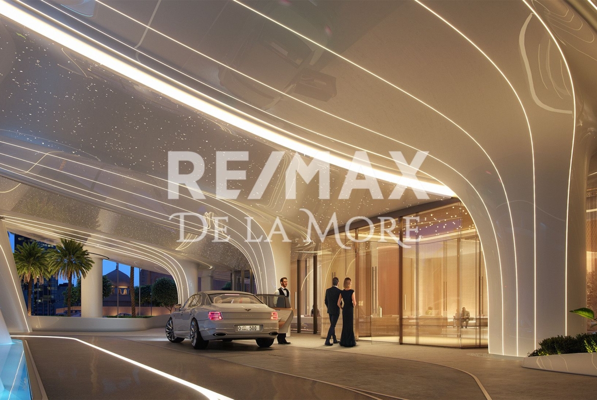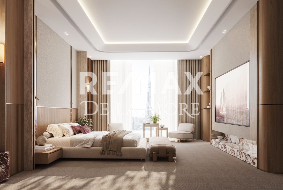 The project features studios, 1–3 bedroom apartments, Royal Suites, and Royal Wings. Each residence uses fine natural materials and soft, contemporary tones. Floor-to-ceiling windows frame panoramic views of Burj Khalifa, Dubai Water Canal, and the city beyond. Select homes even include private pools, adding exclusivity to everyday life.